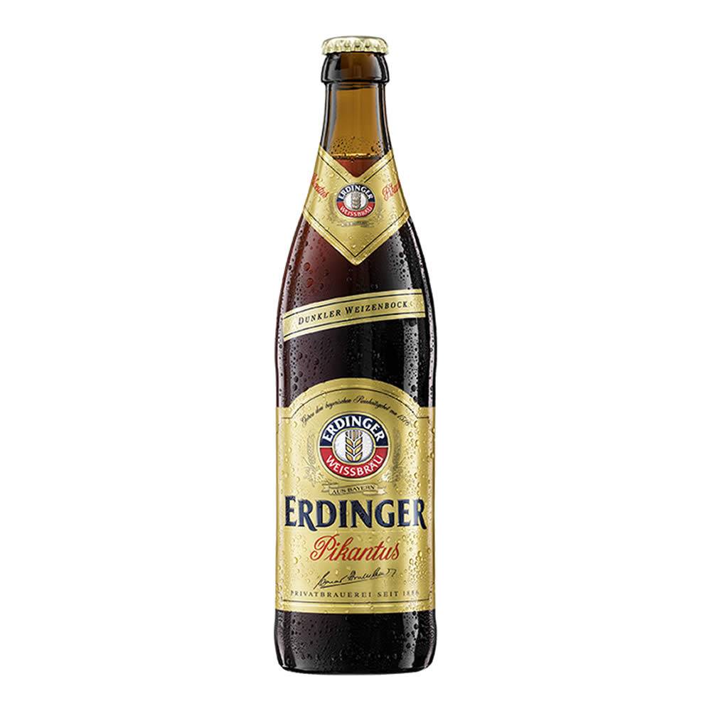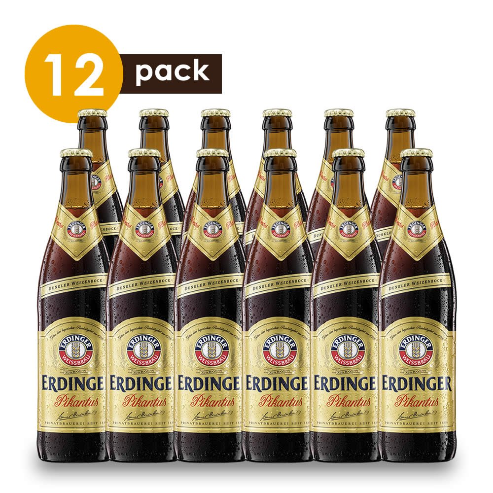 Beerpack de 12 cervezas alemana Erdinger Pikantus. De color marrón, con fuerte sabor a la utilización de maltas de trigo oscuro y cebada. Maridaje puerco asado, jamón ahumado. Queso manchego español y souflee de plátano. 7.3% de alcohol. Cerveza de Alemania.