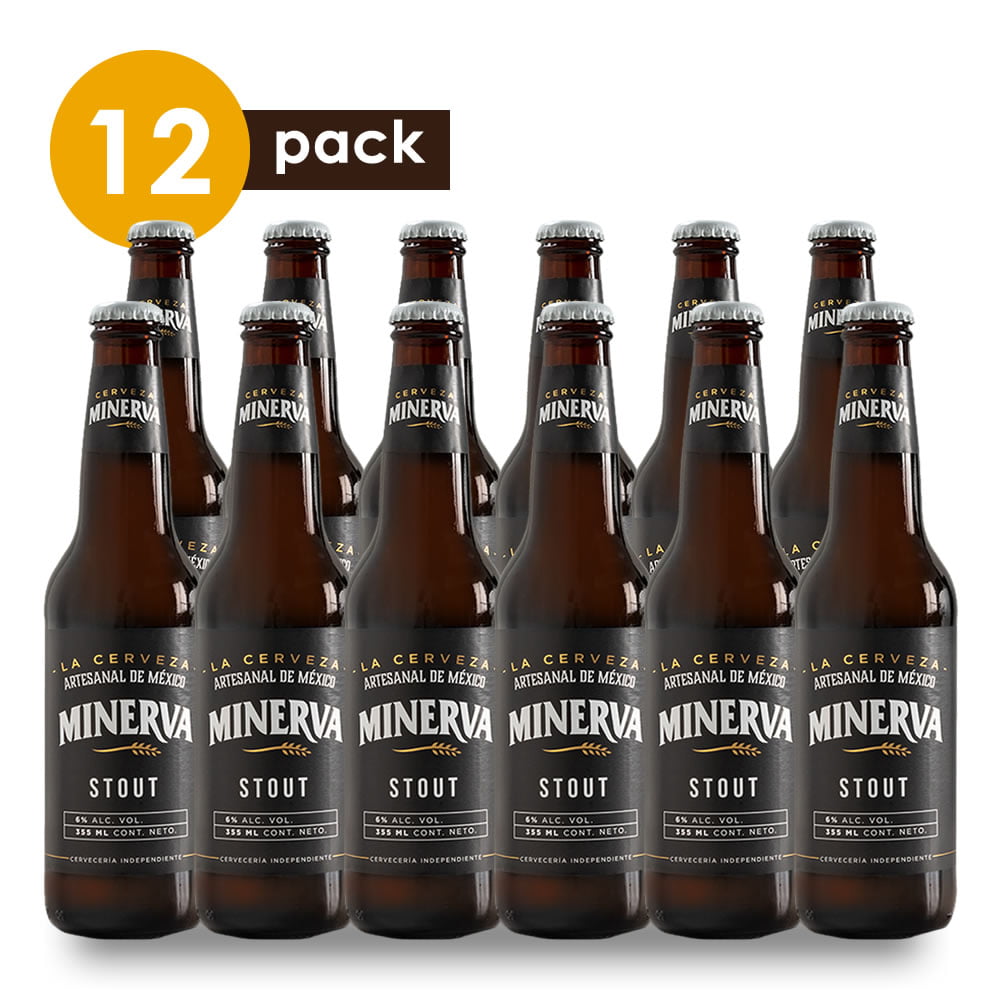 Beerpack de 12 cervezas artesanales Minerva Stout. Cerveza de color negro intenso. De fermentación Ale. Aroma a cacao debido a que en su elaboración se utilizan maltas cafetosas y maltas chocolate perfectamente tostadas. Cerveza Minerva Stout es el orgullo de Minerva, sin duda el estandarte de la revolución cervecera en México.