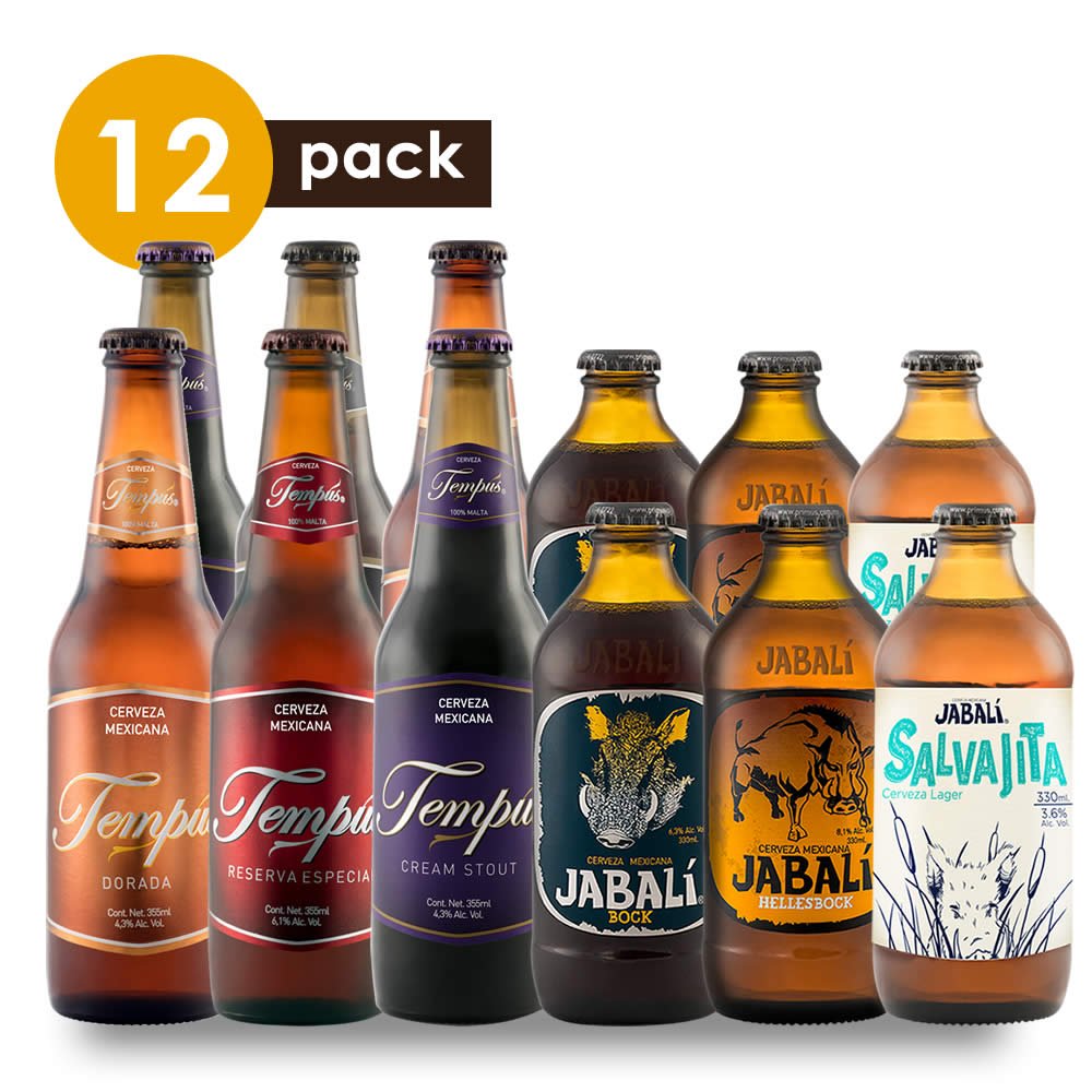 Beerpack de 12 cervezas artesanales Tempus y Jabalí. Selección de cervezas para disfrutar y compartir: Bock, Hellesbock, Salvajita, Dorada, Cream Stout, Reserva Especial y Doble Malta